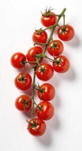 Description: Cherry tomatoes are round, bite-sized, and so juicy that they may pop when you bite into them. One cherry tomato (17 grams) contains only 3 calories and trace amounts of several vitamins and minerals (2Trusted Source).